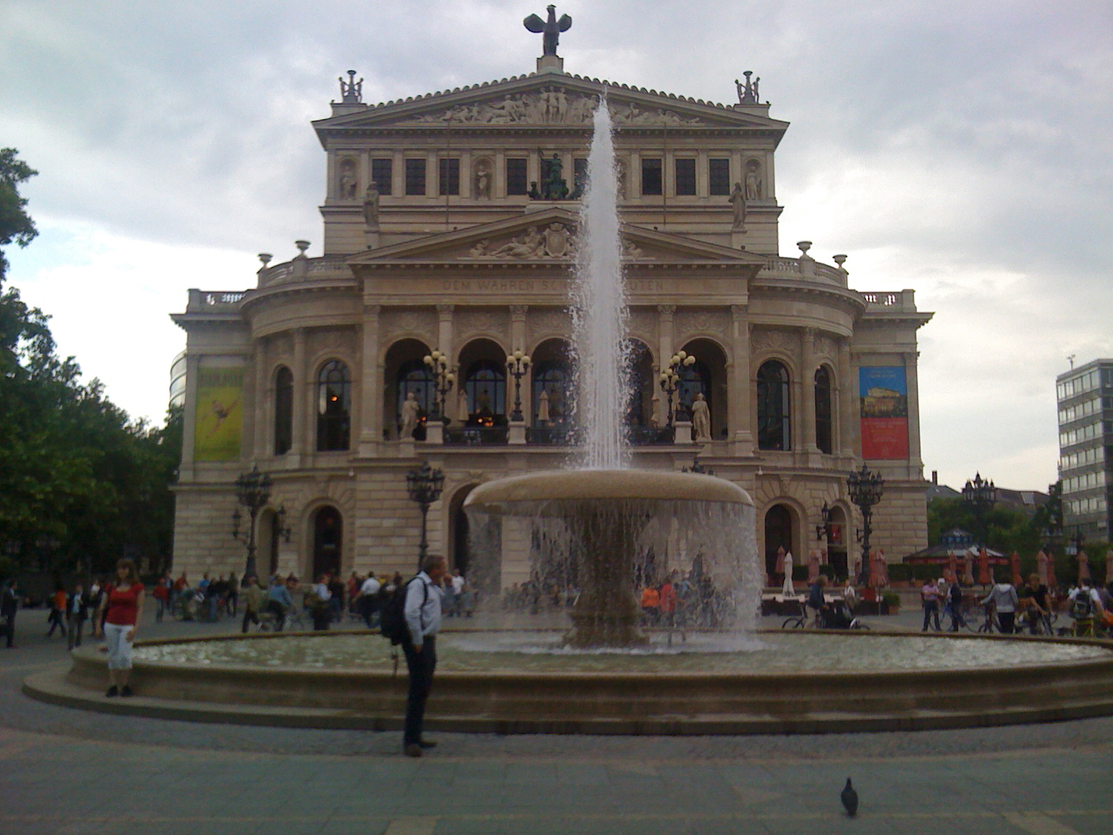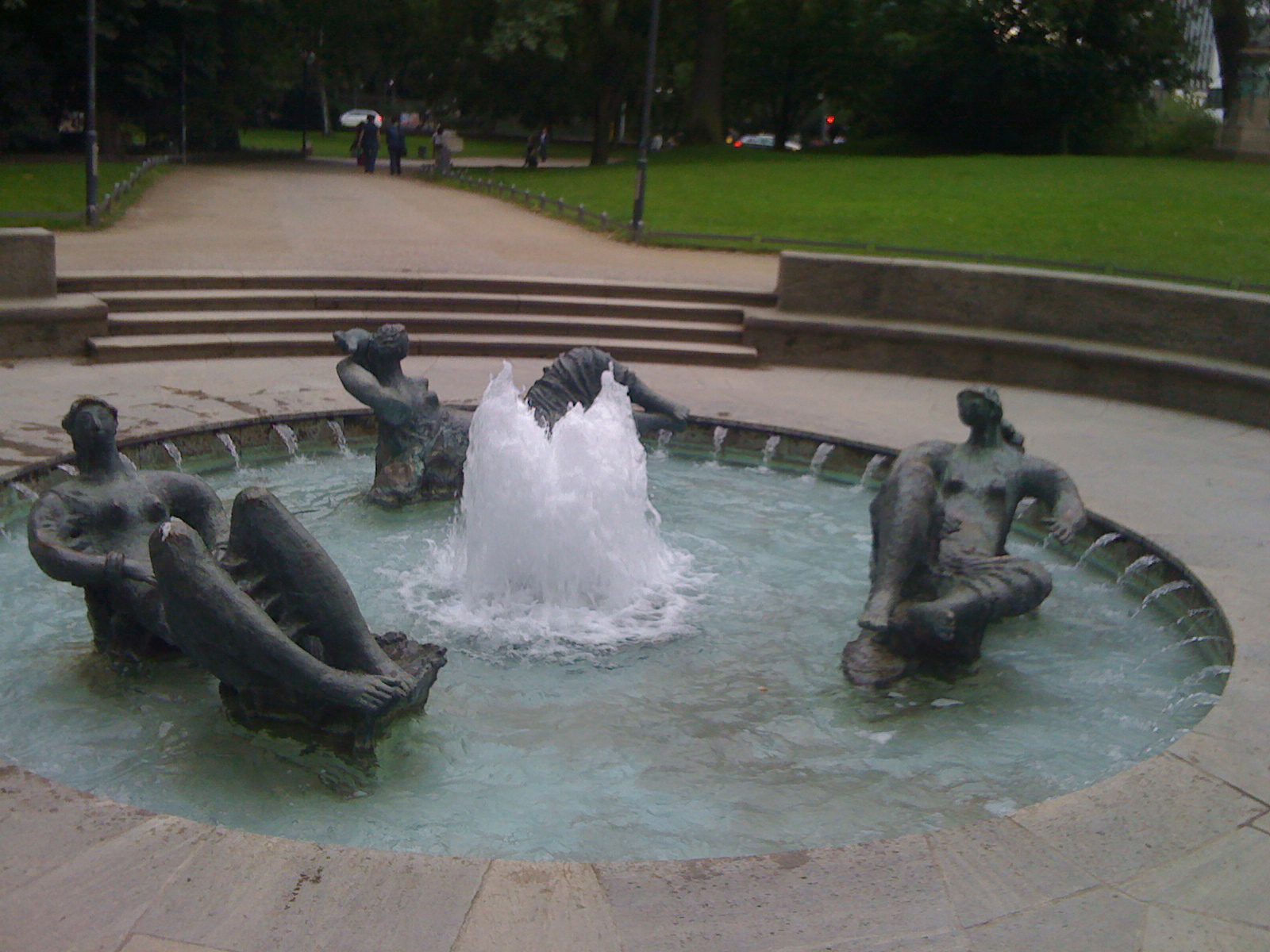 Wir haben den Rundgang am Willy-Brandt-Platz begonnen, mit dem Märchenbrunnen direkt hinter den Städtischen Bühnen. Wie man den Fotos ansieht, war das Wetter nicht ganz optimal, ich hatte eigentlich schon befürchtet, dass wir vor einem Gewitter flüchten müssten – aber wir hatten Glück. Für das Pilotprojekt die Wallanlagen auszuwählen, war in meinen Augen eine hervorragende Entscheidung – bei einer Erweiterung auf 500 Objekte wird es kaum mehr möglich sein, die „Outdoor-Ausstellung“ als Ganze zu besichtigen, aber der Spaziergang durch die Wallanlagen ist definitiv ein Vergnügen. Im Alltag wird es ja auch eher so aussehen, dass Passanten die Codes von ein, zwei oder drei Kunstwerken abscannen – eine schöne Bereicherung für die Mittagspause!