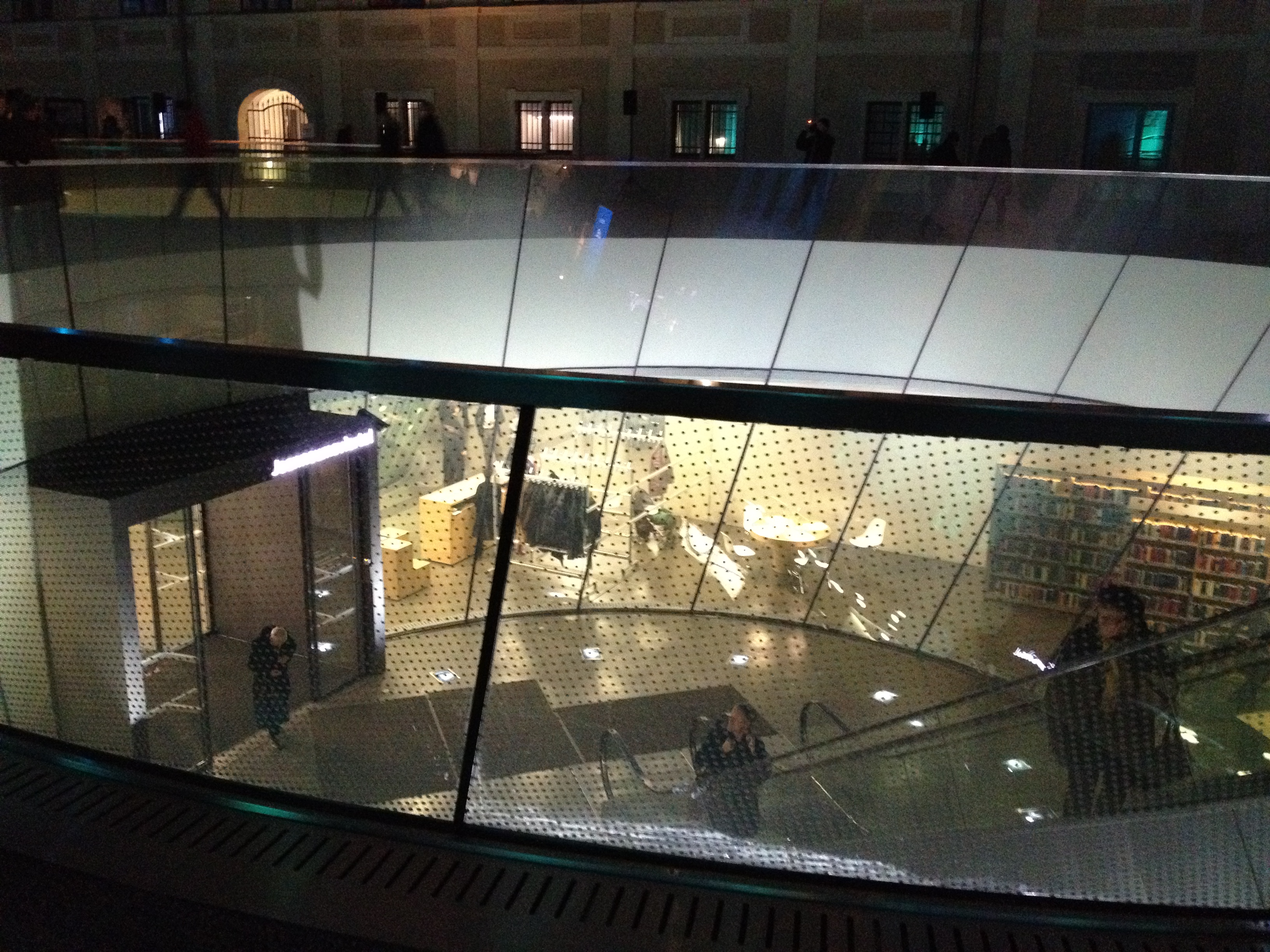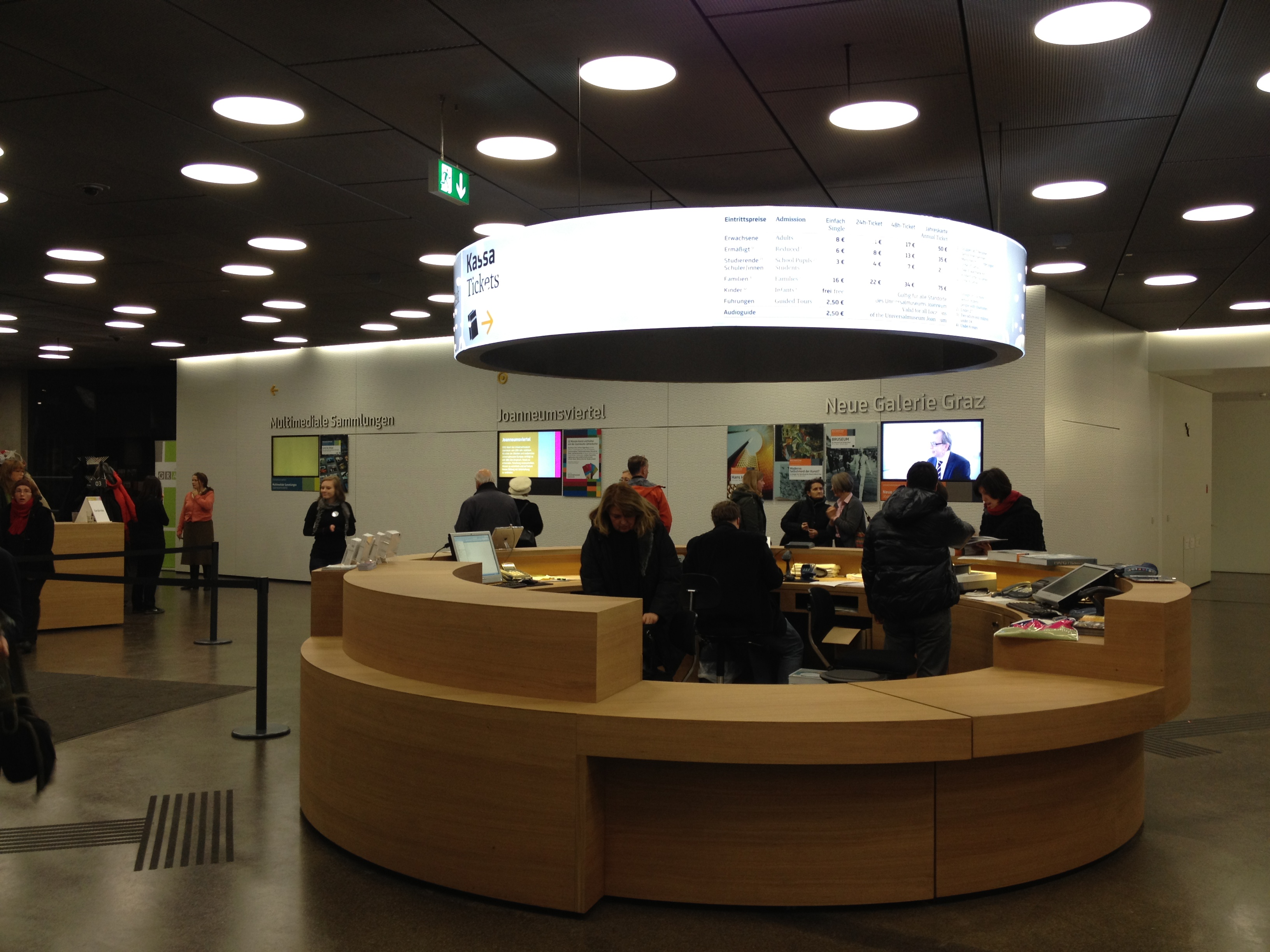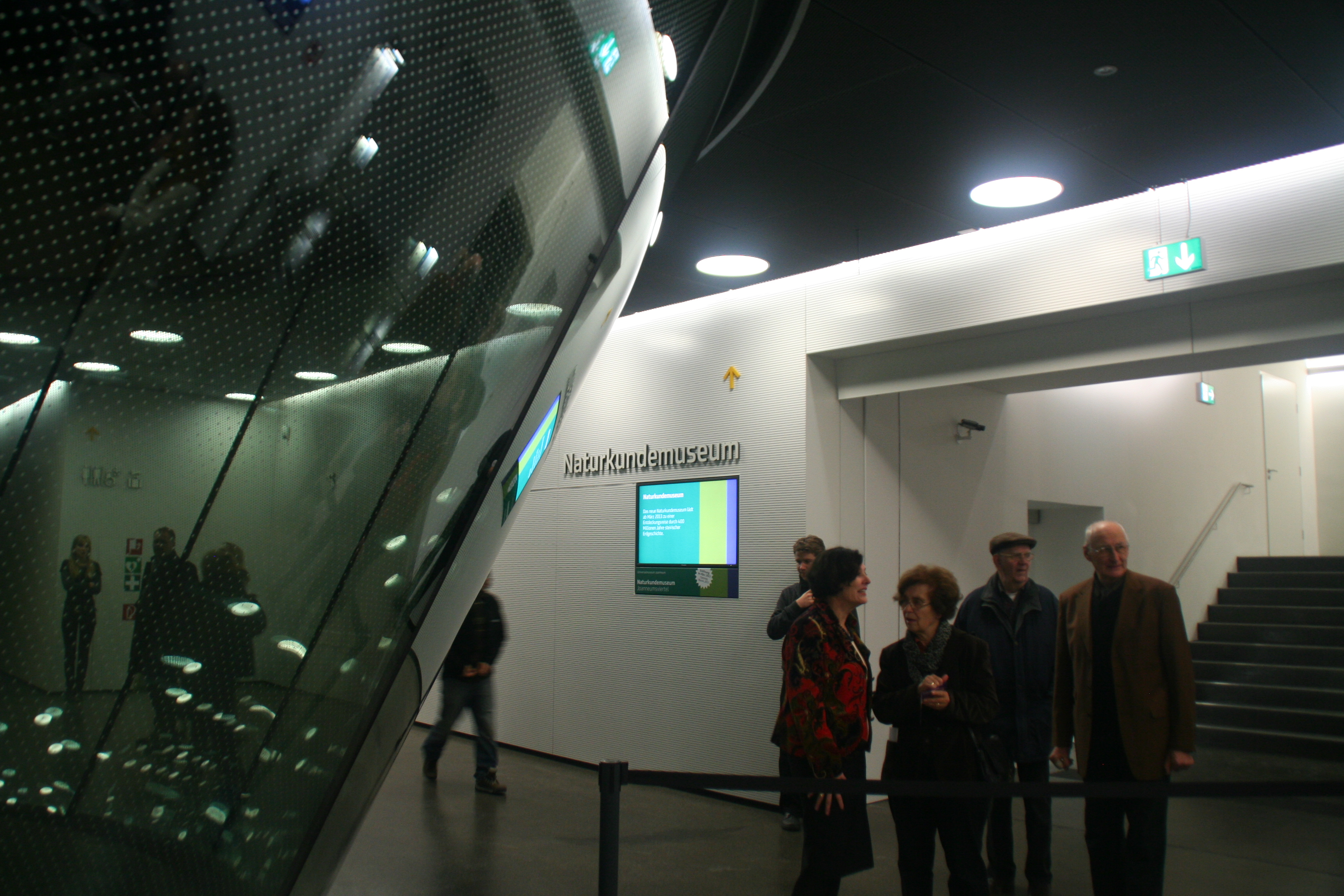 Wie schon erwähnt, gehören zum Joanneumsviertel im Moment die Neue Galerie, das neu entstandene Bruseum, die Multimedialen Sammlungen, die erstmalig Ausstellungsräume zur Verfügung haben und die Steiermärkische Landesbibliothek. Nächstes Jahr wird das Naturkundemuseum dazukommen. Der gemeinsame Zugang zu diesen Bereichen erfolgt über das unterirdische Besucherzentrum. Wenn man über den Platz läuft, bemerkt man mehrere gläserne Krater, die in die Erde hineingehen – man kann also von oben ins Besucherzentrum hineinschauen.
